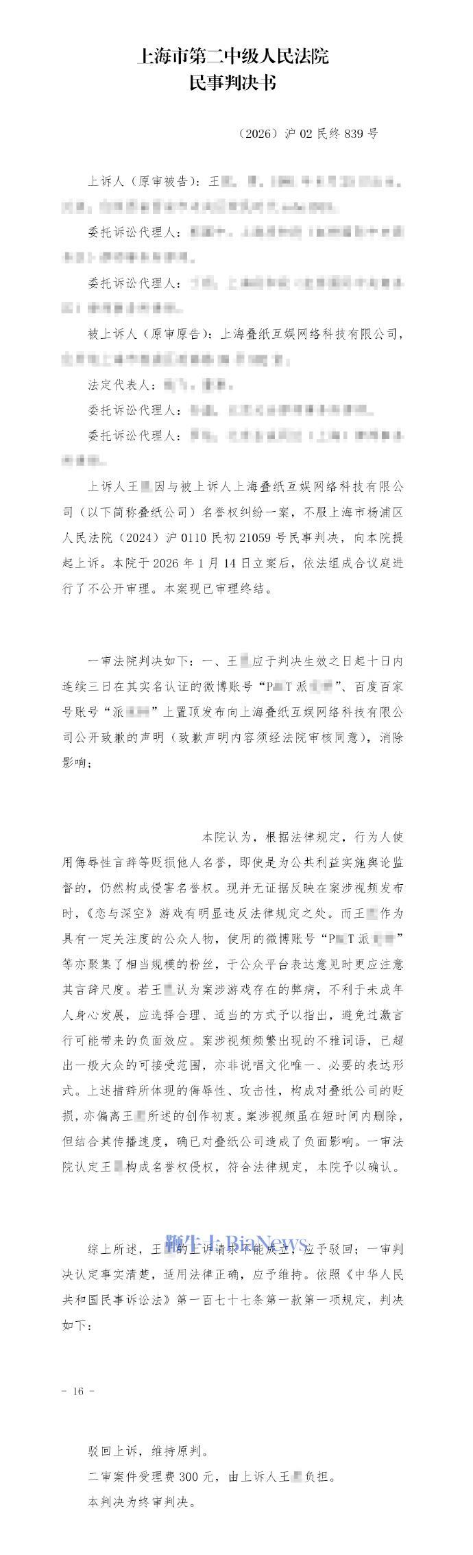 官方表示,关于P*T派*特侵犯恋与深空名誉权等相关案件,自2024年9月恋与深空提交立案材料以来,此案先后经历了被告提出管辖权异议及上诉均被驳回、一审恋与深空胜诉、被告再次上诉的数次波折,终于在2026年4月14日迎来终审判决。依照判决结果,被告需在判决结果下达10日内向恋与深空公开道歉并持续3日。