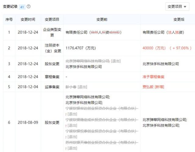这意味着,广州弹幕网络科技有限公司成为了北京快手科技有限公司的全资子公司。同时,该公司的注册资本也进一步提高,达到了4亿元。