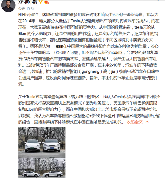 Bianews 3月2日消息,小鹏汽车CEO何小鹏在微博上称,绝大部分人低估了Tesla对传统汽车的挑战,而又高估Tesla在中国的竞争力。