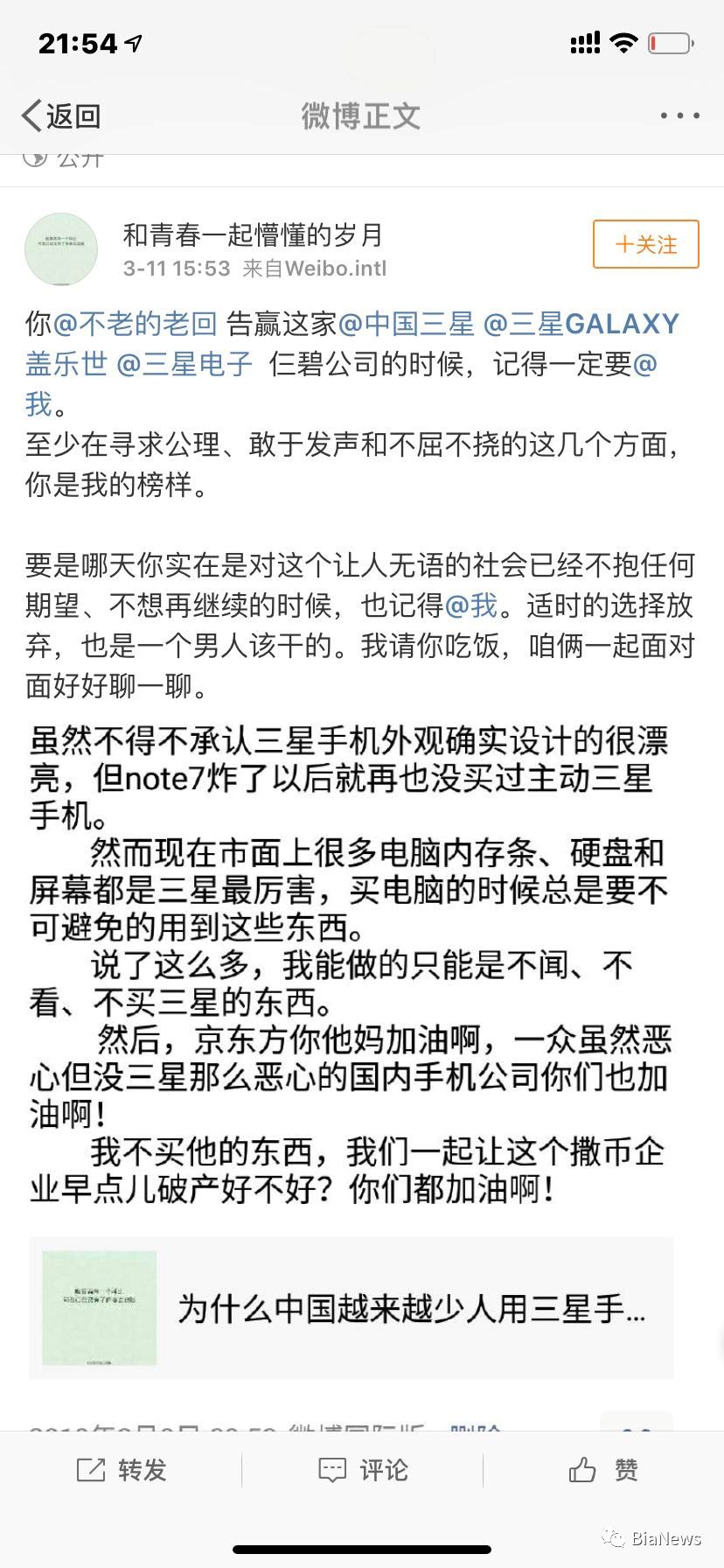 Bianews:除了炸机事件,维权这三年也会关注三星本身的研发技术发展、作为外资企业给国内带来的经济贡献吗?对这些,你是否认可?你认为这与你维权有关联吗?或者说会影响到维权心态吗?