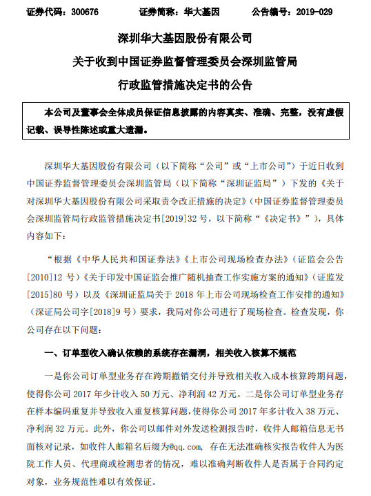 华大基因:收到证监局行政监管措施决定书
