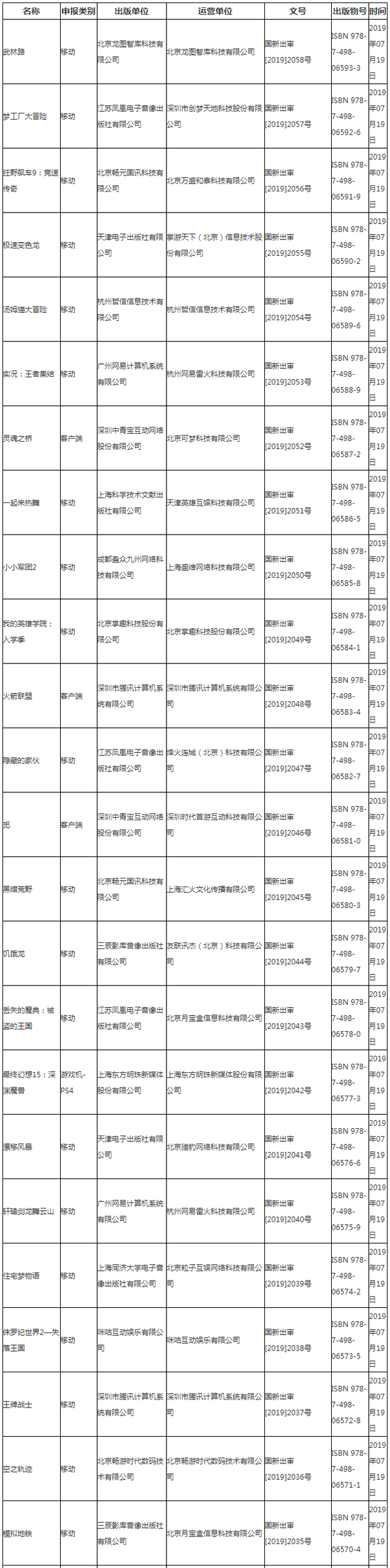 附:2019年进口网络游戏审批信息更新(2019年7月19日)
