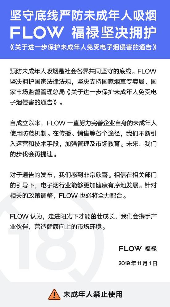 鞭牛士 11月1日消息,针对国家烟草专卖局、国家市场监督管理总局发布的通告,FLOW电子烟回应称,将全力配合相关政策调整,严防未成年人吸烟。