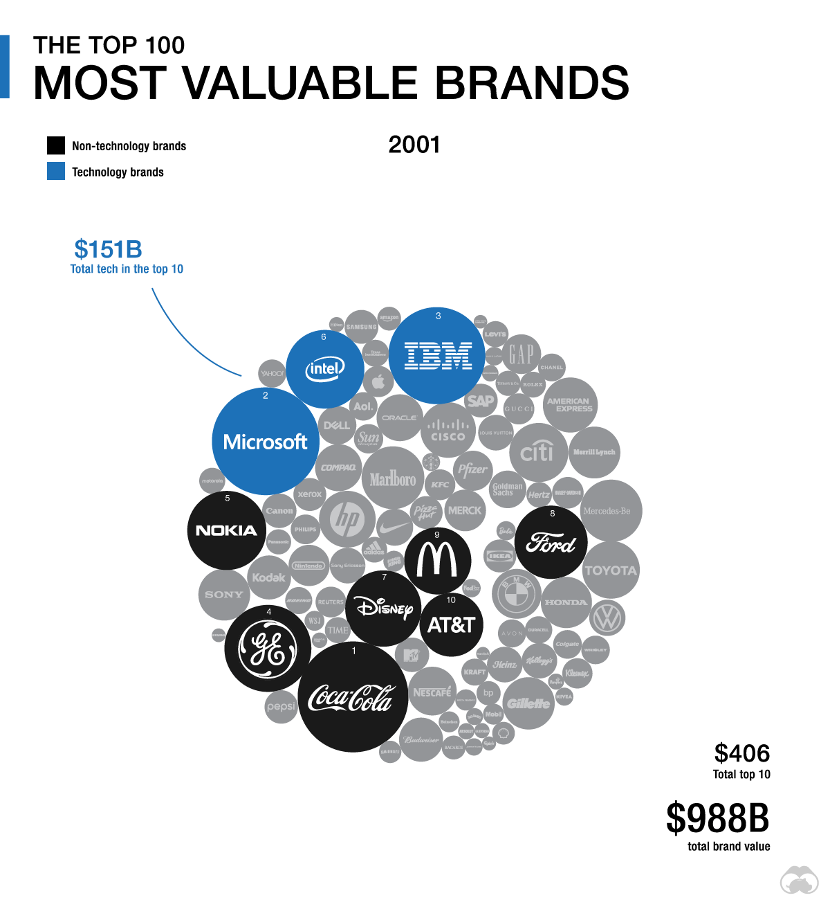 据Interbrand,2001年,报告统计的100个品牌的总价值为9880亿美元。如今该价值则达2.1万亿美元,平均复合年增长率为4.4%。多年来,全球科技巨头在排行榜中迅速攀升,如今已占品牌总价值的很大一部分。