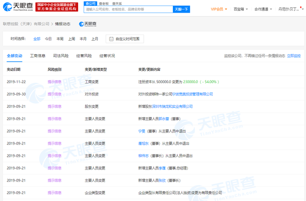 鞭牛士11月27日消息,据天眼查数据显示,11月22日,联想控股(天津)有限公司发生注册资本变更,由原来的50亿变更为23亿。