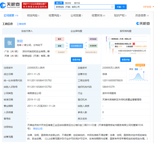信息显示,联想控股(天津)有限公司成立于2011年11月,法定代表人为张欣。公司分别由联想控股股份有限公司、深圳市瑞龙和实业有限公司各自持股50%。