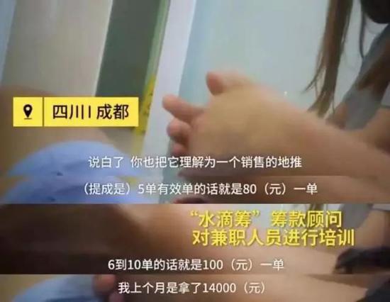 根据梨视频最新暗访视频,水滴筹名义上的志愿者,实际上也就是地推人员,有兼职和全职之分,平台都提供报酬。在操作过程中,筹款顾问们并没有核实患者信息,往往都是随意发起金额筹款,这些销售是有提成的,每单最高提成150元,有的销售员甚至月入过万。