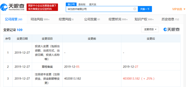 值得注意的是,天眼查数据显示,2019年12月19日,华为投资控股有限公司同样发生工商变更,注册资本由原来的约222亿人民币新增至现在的约294亿人民币,增幅为32%。