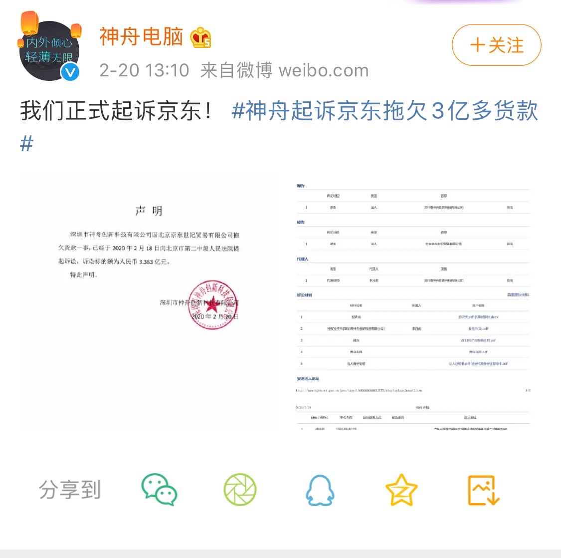 鞭牛士 2月20日消息,今日,神舟电脑发布微博称,我们正式起诉京东。神舟电脑在声明中表示,深圳市神舟创新科技有限公司因北京京东世纪贸易有限公司拖欠货款一事,已经于2020年2月18日,向北京第二人民中级法院发起诉讼,诉讼的金额为3.383亿元。