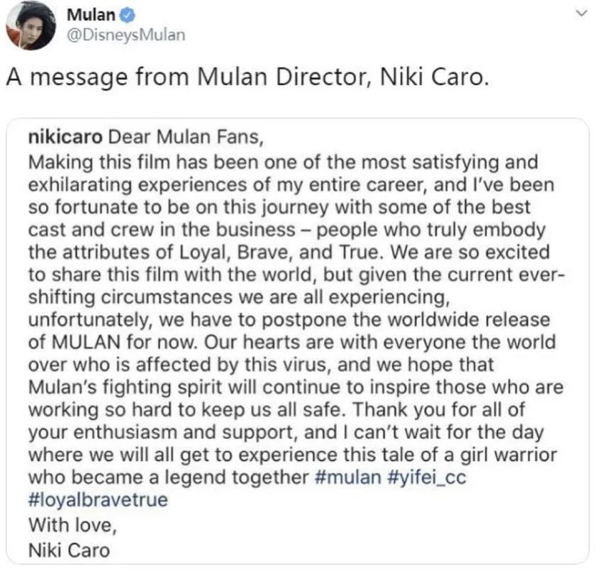 受疫情影响,影视业寒流同样在国外蔓延。 投资界(ID:pedaily2012)3月13日消息,原定于2020年3月27日在北美上映的迪士尼电影《花木兰》宣布全球撤档,新档期尚未宣布。最新消息显示,迪士尼计划让《花木兰》在今年内重新在全球多地上映,内地最早也要5、6月。 早在本月初,迪士尼发言人还信誓旦旦地表示:迪士尼未来的电影都坚持原档期,《花木兰》绝不改档。而在三天前,《花木兰》刚刚结束在洛杉矶举行的全球首映礼,如今突然的撤档也意味着这段时间的宣发费用几乎全都打了水漂。 这并非个例。3月12日,索尼影业出品的《彼得兔2:逃跑计划》宣布延期公映;3月13日,环球新片《速度与激情9》片方宣布,电影将推迟近一年上映;原定于下周五上映的《寂静之地2》也宣布推后.....有媒体预测,本次疫情会导致全球影视行业高达50亿美元的亏损。国内电影行业曾经历过的痛苦,正发生在国外影视行业里。 砸下2亿美元,试镜1000多人挑主演 刘亦菲宣发白忙活了 一顿宣发猛如虎后,《花木兰》准备撤档了。 导演妮基·卡罗在推特上写道,考虑到如今不断变化的疫情局势,《花木兰》不得不在全球范围内推迟上映。“我们的心与全世界所有感染了病毒的人同在,同时,我希望木兰的战斗精神可以激励所有在一线奋战抗击疫情的人们,是你们保障了我们的安全。” 这个决定非常突然,相比其他主动撤档的影片而言,《花木兰》是颇为纠结的那一个。受疫情影响,《花木兰》先是选择暂别亚洲市场,但仍坚守着北美市场,保持铺天盖地的宣传,并于三天前高调举行了首映,口碑颇佳。 迪士尼不愿改档无可厚非,毕竟这段时间一直在铺天盖地的做宣发,请来格莱美获奖歌手克里斯蒂娜·阿奎莱拉创作主题曲,女主角刘亦菲本人更是忙前忙后,不仅登封二十三本海外杂志,还亲自演唱《花木兰》中文主题曲《自己》。一旦撤档再上映,前期努力都将大打折扣。另外,数据显示,今年迪士尼有20多部影片上映,档期紧凑不好打乱。显然,对于迪士尼而言,这是一个非常艰难的决定。 而作为迪士尼2020开年重磅之作,《花木兰》被寄予厚望。电影根据1998年迪士尼同名动画片改编,讲述了花木兰女扮男装,代父从军、勇战匈奴的故事。22年后翻拍真人版,迪士尼为此费尽心思,为选出木兰一角曾举行了全球海选,耗费两年遍访五大洲,试镜了近千位演员,才最终敲定刘亦菲。 将完美贯彻到底的迪士尼在砸钱上也毫不含糊,据外媒报道,《花木兰》制作经费高达2亿美元,折合人民币14亿,按着电影票房分账来看,《花木兰》全球票房需要达到六亿美金,也就是42亿元人民币才能达到收支平衡。而《花木兰》开画首周票房预测已达到5000万-8000万美元区间。 虽然成绩不错,但压力同样不小。有别于其他迪士尼合家欢电影,由于国仇家恨情节的存在,美国将之划分到了13岁以下不宜观看的级别,如此一来,受众自然受限。 而作为一部普及度极高的电影,中国观众对《花木兰》的期待不言而喻,但预告片出来后曾被多方吐槽。首先,动画中的灵魂人物木须龙被拿掉了;而说好的“当窗理云鬓,对镜贴花黄”直接变身“华为荣耀妆”;北魏时期的木兰一家竟然住进了明朝才会有的福建土楼…… 值得注意的是,当年动画版上映时,人物木兰的丹凤眼,厚嘴唇和黑重眉毛也引起过不小争议,但1998年上映后却反响极佳,在全球席卷超过3亿美元,位列全球第七,并获得金球奖和奥斯卡提名。而这次有“神仙姐姐”扛大旗,创造票房奇迹也是有可能的。 全球影视停摆 意大利关闭所有影院,影视大片集体撤档 事实上,《花木兰》撤档只是全球影视行业惨淡现状的一缕缩影。 眼下,国内的疫情防控有条不紊,国外的紧张形势令人揪心。赤裸裸的数据更具冲击力:据丁香医生最新数据,截至3月13日,全球累计确诊133091例,其中国外累计确诊52107例,较昨日增加5382例,累计死亡1787例,较昨日增加226例,不容乐观。 截图源自丁香医生全球疫情地图 新冠肺炎逐步肆虐全球,疫情的影响也日渐凸显,影视行业也未能幸免。 意大利作为重灾区,迅速拉下影视行业的大幕。此前有外媒报道称,根据意大利全国电影院零售商协会统计,意大利因为疫情已经关闭850家影院,约占意大利全国影院的45%。这场关闭潮持续升级,据法新社3月8日消息,意大利政府宣布关闭全国范围内的电影院、剧院和博物馆。自此,意大利影视行业完全停摆。 然而,这只是冰山一角。受疫情影响,全球各地多部影视剧不得不按下暂停键:汤姆·克鲁斯新片《碟中谍7》因为在威尼斯取景,只得暂停拍摄计划;道恩·强森新片《红色通缉令》也取消了意大利拍摄计划;漫威新电视剧《猎鹰与冬兵》和玄彬新电影《交涉》也相继暂停拍摄……全球影视行业一脚迈进速冻模式。 与此同时,一股浩浩荡荡的撤档潮席卷而来。除开备受瞩目的《花木兰》之外,众多影片也被迫加入撤档大军——原本要在韩国公映的黑白版《寄生虫》《狩猎的时间》以及《Call》全部宣布撤档;好莱坞影片《007:无暇赴死》《速度与激情9》也相继宣布撤档;就在昨晚,导演约翰·卡拉辛斯基更是官宣,受新冠疫情影响,《寂静之地2》全球撤档,具体上映时间待定。 覆巢之下,焉有完卵。剧组停摆,影视停拍,复工遥遥无期,演员的日子也不好过。更何况,国外疫情还有愈演愈烈的趋势。3月12日,汤姆·汉克斯和丽塔·威尔逊夫妇就向媒体发布