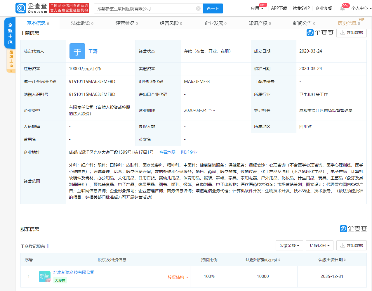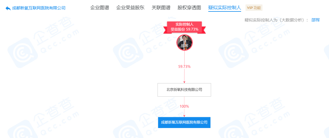 鞭牛士 3月27日消息,据企查查数据显示,成都新氧互联网医院有限公司成立于3月24日,注册资本10000万元人民币,法定代表人为于涛,经营范围包含外科;妇产科;眼科;口腔科;医院管理、运营等。该公司由北京新氧科技有限公司100%控股,疑似实际控制人为邵珲,受益股份为59.73%。