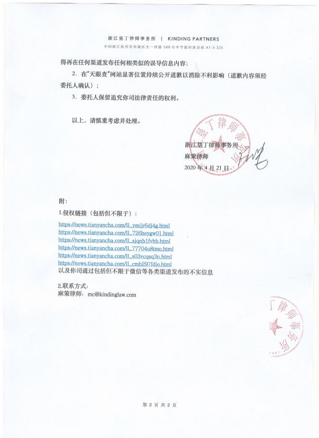 2.在“天眼查”网站显著位置持续公开道歉以消除不利影响(道歉内容须经委托人确认) ;