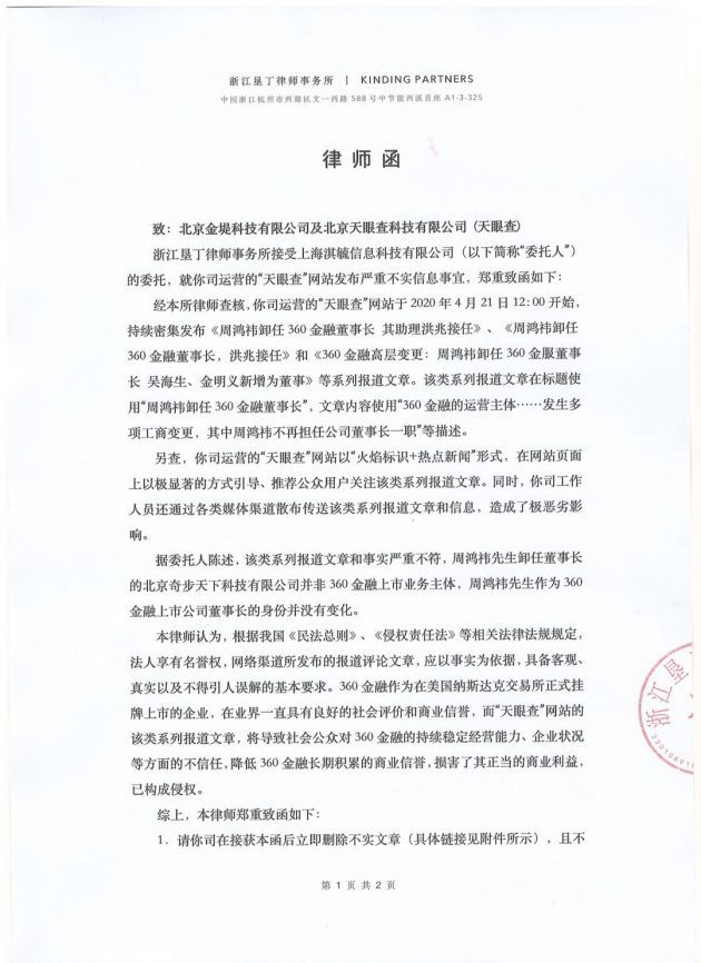 同时,360金融表示,已准备起诉天眼查,委托浙江垦丁律师事务所,以“天眼查”网站发布严重不实信息事宜为由,向北京金堤科技有限公司及北京天眼查科技有限公司发去律师函。