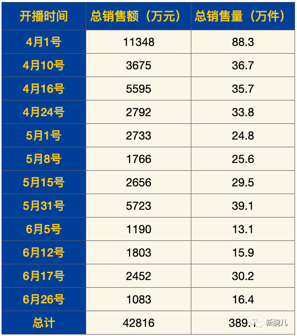 「新腕儿」把老罗每一场的数据都罗列了出来,其中几个主要数据指标,包含了销售总金额,销售总量,观看人数,打赏金额等。