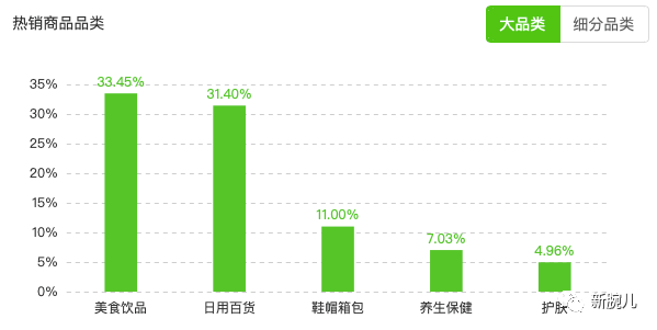 「新腕儿」以6.17日的那场直播数据作参考,为了618大促,当日老罗进行跨夜直播。该场直播一共上架了76件商品,而其中美食饮品类和日用百货分别占了33.45%和31.4%,鞋帽箱包11%,养生保健7.03%分列三四位。