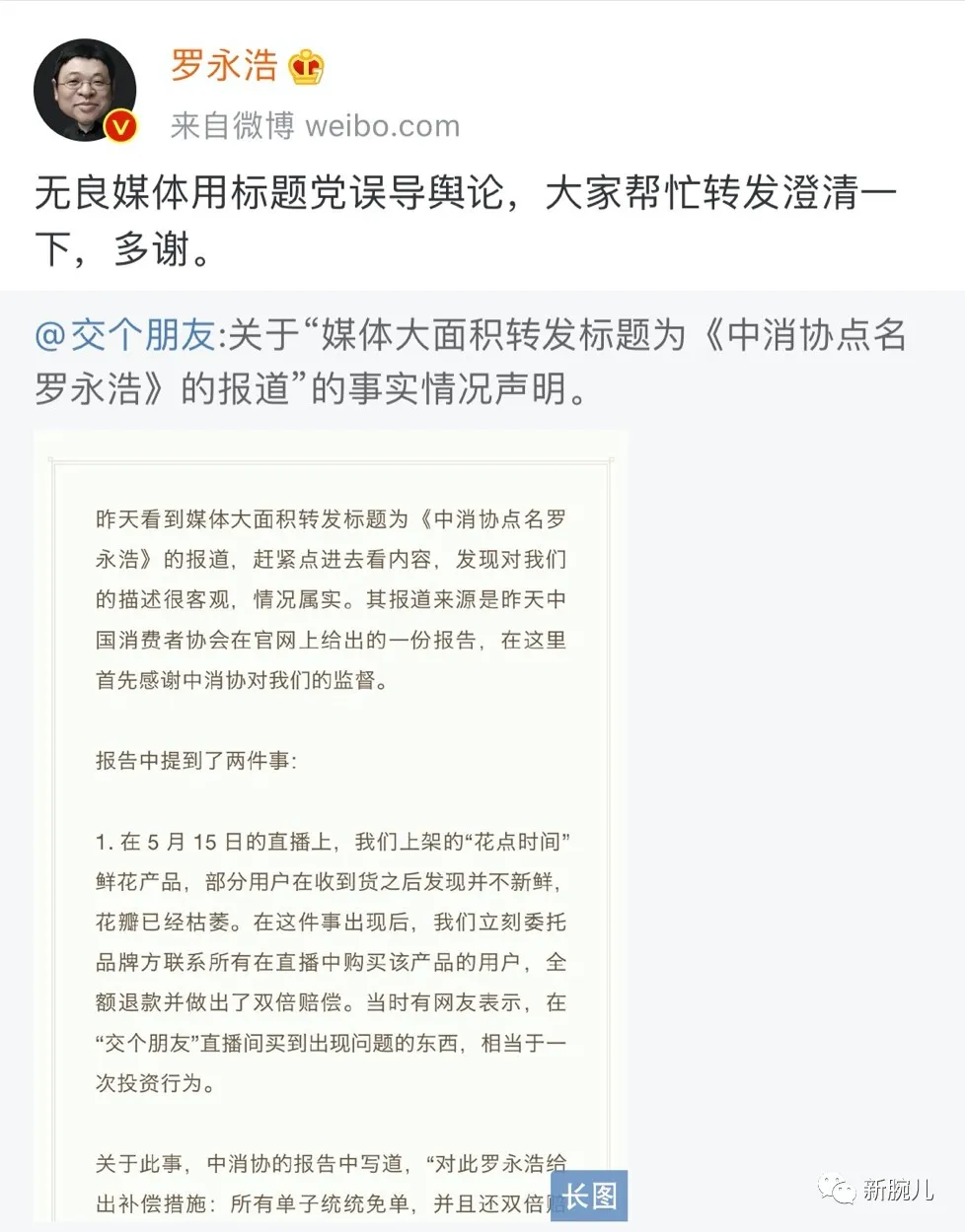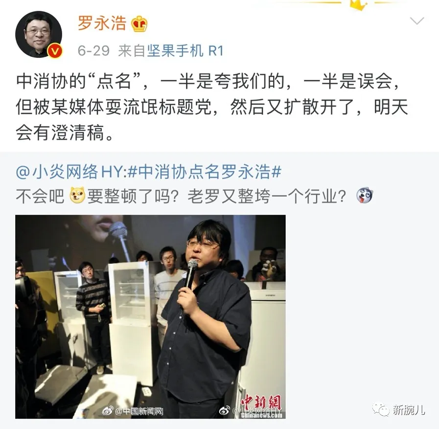 前两天有媒体报道老罗直播带货被中消协点名,老罗随即在微博进行了简单的回应,还马上安排了公关人员进行解释,微博紧接着就转发了针对此事件的澄清稿。