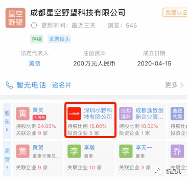 「新腕儿」从企查查查询到,这家公司成立于今年4月14日,法定代表人兼大股东为黄贺,持股64%,深圳小野科技有限公司持股15%,其中还看到了上海峰瑞创投的持股,占股1%。