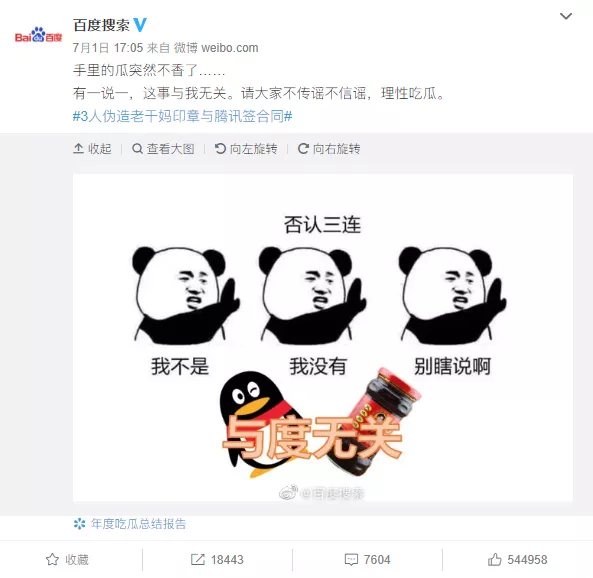 这个人的动机是什么?闲着没事给比亚迪做广告么?按照已知的情况,这个李娟自己声称自己一直为比亚迪服务,被一个假高管给忽悠了,叫陈振宇。 但比亚迪表示根本没这个人。 当时很多广告公司都因为相信这是比亚迪官方的正规合同,然后放心的给执行端垫款,最后把自己给垫死了。 至于李娟到底是为了吃回扣,还是被骗了,现在都还没有结论,这在广告业是非常经典的一个案件,里面真真假假虚虚实实,很多事情都比较诡异。 最后,企鹅看似吃了亏,但输了么? 完全没输。 首先是声誉和公关效果满分,已经立于不败了。 另外我再次强调,这个案子现在看着各种反转,各种热闹,但还没有真的终结。 企鹅不会闲着没事儿乱起诉,老干妈也不会闲着没事儿发声明。 起码要等到贵阳警方的调查结果才有进一步的进展。 大家安心吃瓜,好好看戏就好。 生活已经这么苦涩了,只有瓜的甜,才能安抚我们凄惨的心。