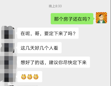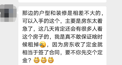 跟着中介看房子,然后你就发现,在中介的嘴里,啥房子都好租,啥房子都马上要马上租出去了,每套房子都是上午刚有人过来看过。反正紧俏的很,好像一下子你看的每一个都成了抢手货,这是为了抓紧让你付款,实在不行,先交个定金也成:中介的工作就是看房,他们也不想到处跑,陪你看的越多,挑选越多,他们的时间成本越高,有了比较,你也容易犹豫,发现的问题也越多,所以尽快定下来是符合他们的利益的。你可以自己去调查嘛,我看上的那套房子,其他的平台上也挂了房源信息,是6月中旬挂上去的,我又看了一个多星期,前前后后算下来,现在一个月快过去了,我刚才问了一下: