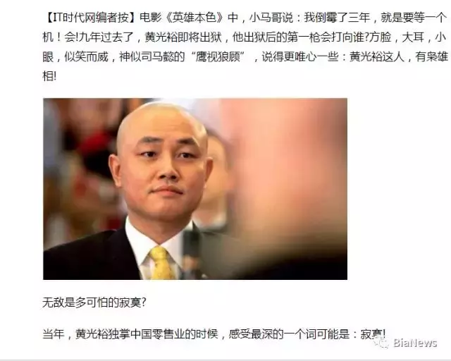 文章写道,“九年过去了,黄光裕即将出狱,他出狱后的第一枪会打向谁?方脸,大耳,小眼,似笑而威,神似司马懿的“鹰视狼顾”,说得更唯心一些:黄光裕这人,有枭雄相!”