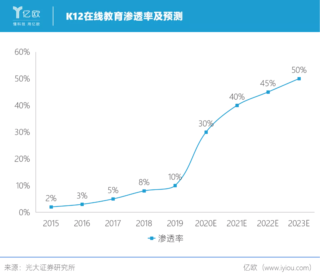 居家期间官方、校方对于线上教育的支持,让1.9亿的K12人群体验了在线教育,渗透率加速提升。