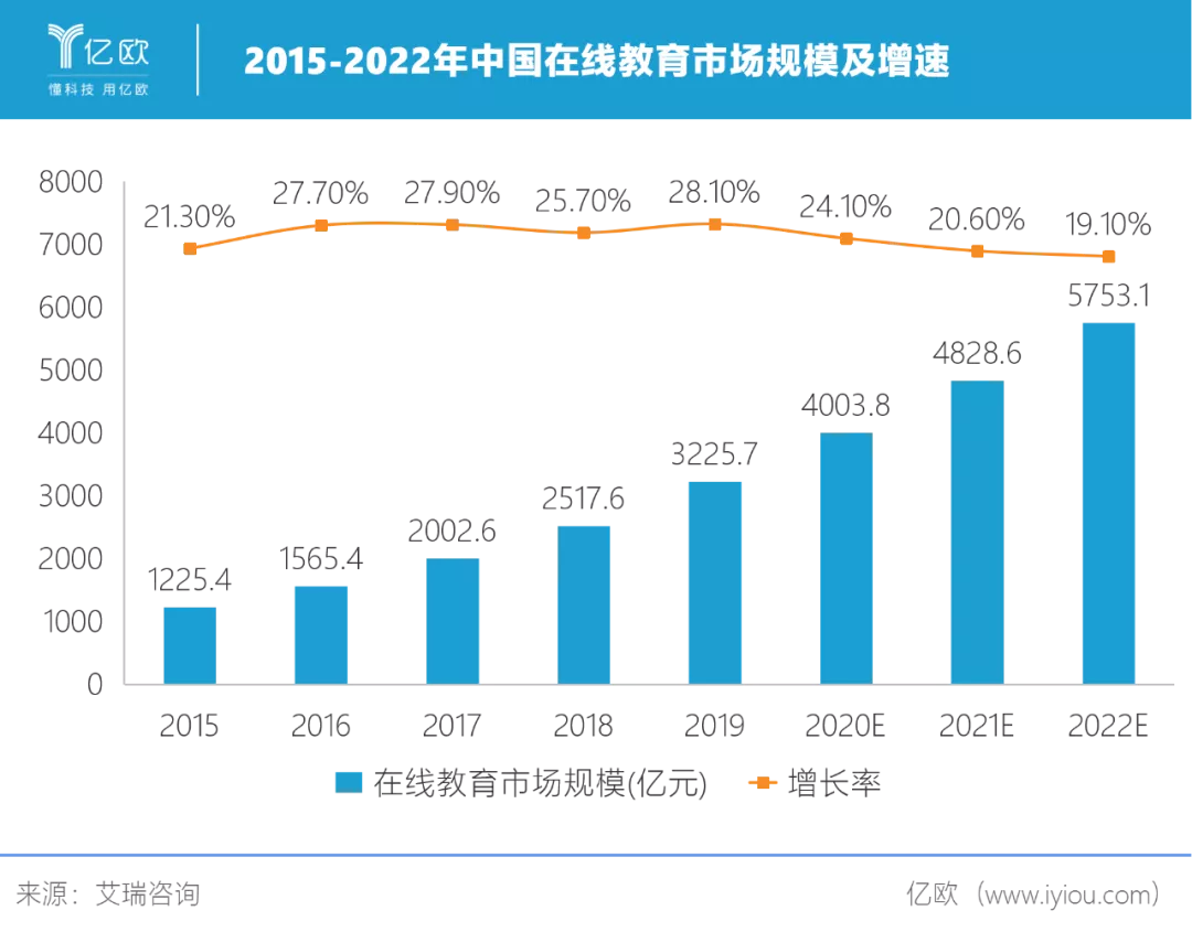 根据艾瑞咨询数据,2019年中国在线教育市场规模3225.7亿元,同比增长28.1%,预计未来三年市场规模增速仍将保持在19-24%之间。疫情期间,K12在线教育渗透率加速提升,预计将由2019年的10%上升到2020年的30%,在2023年将超过50%。