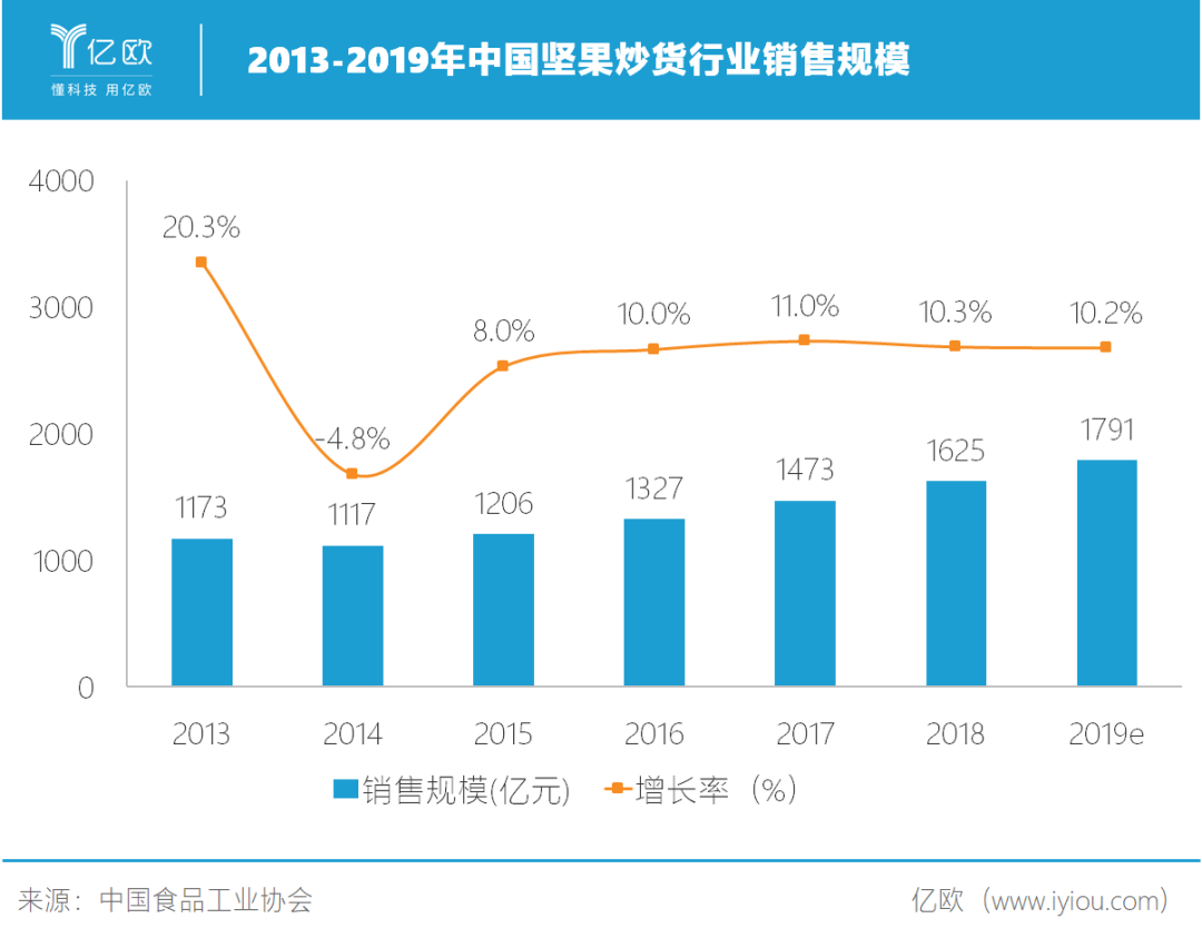 中国食品工业协会数据显示,2018年我国坚果炒货行业规模以上企业销售规模达1625亿元,未来2-3年内将持续保持高速增长态势。