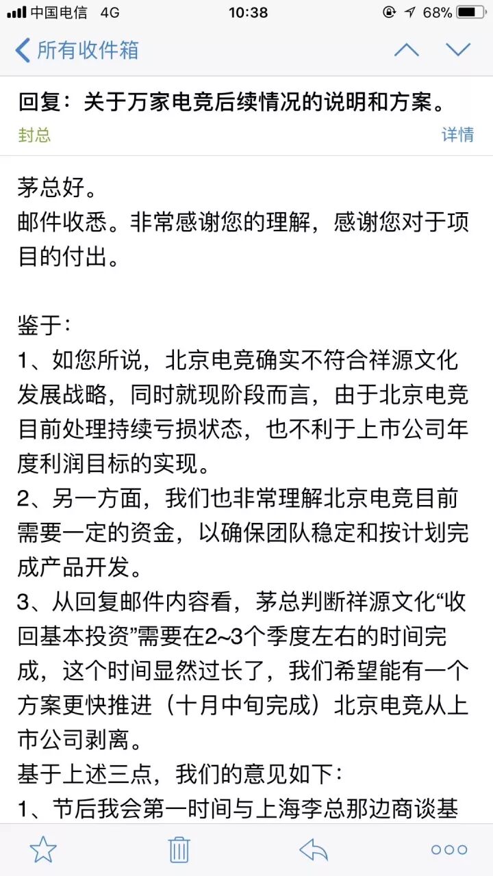 祥源文化在与茅侃侃邮件往来中表示,希望万家电竞能在十月中旬就从上市公司剥离。
