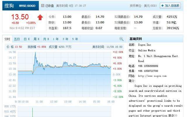 1、搜狗登陆纽交所首日收盘价为13.50美元