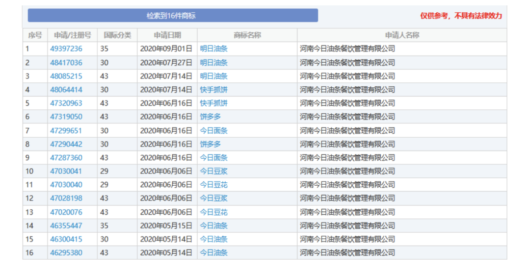 让人惊讶的是,目前今日油条公司还申请注册今日油条、今日豆浆、今日豆花、今日面条、饼多多、快手抓饼等商标,状态为注册申请中。