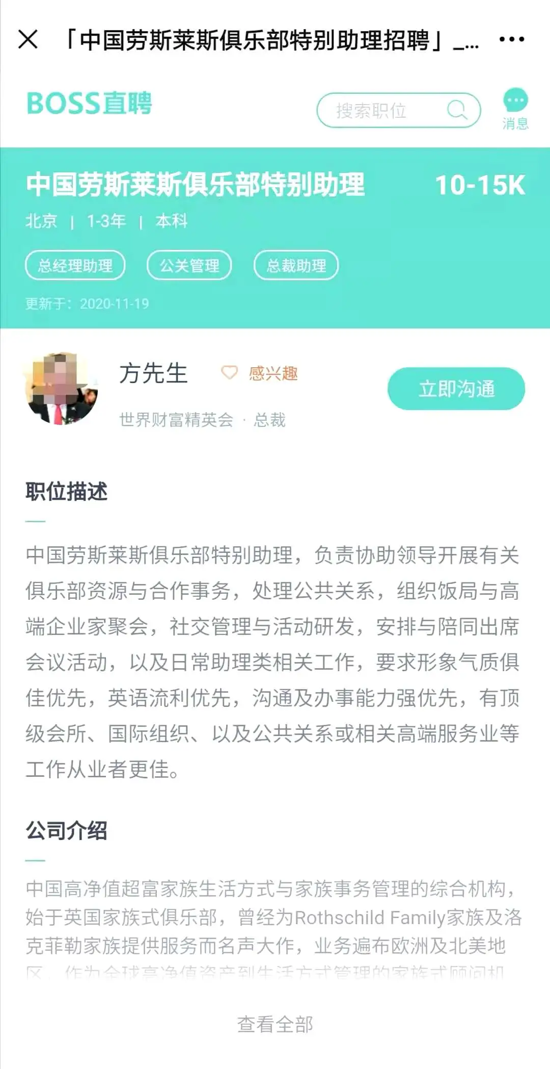 11月上旬,一家名为“世界财富精英会”的机构在BOSS直聘上招聘“中国劳斯莱斯俱乐部特别助理”岗位,薪资待遇为每月1万元至1.5万元。新京报记者以应聘者的身份发起了沟通。