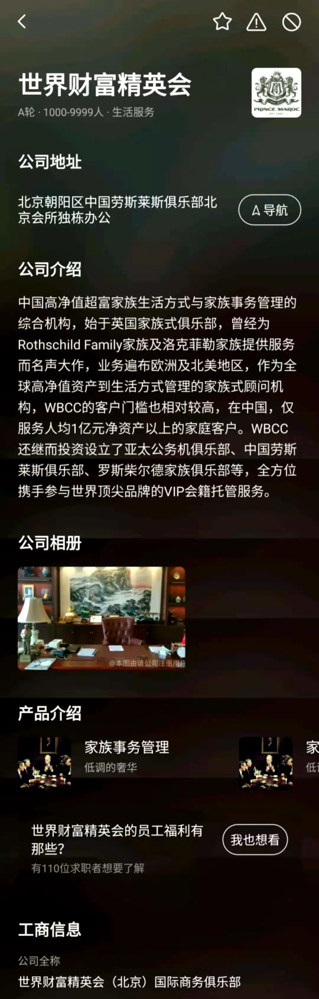 BOSS直聘上的公司介绍显示,“世界财富精英会”是“中国高净值超富家族生活方式与家族事务管理的综合机构,始于英国家族式俱乐部,曾经为Rothschild Family家族及洛克菲勒家族提供服务而名声大作,在中国,仅服务人均1亿元净资产以上的家庭客户。”