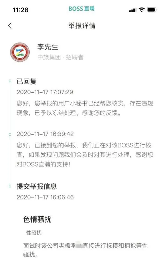 客服来电后又半小时,记者在平台上收到回复称,中族集团的招聘账号经核实存在违规现象,已予以冻结处理。