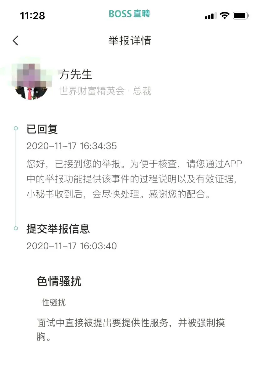 11月17日下午,新京报记者对世界财富精英会、中族集团两家公司发布的相关岗位进行了举报。约30分钟后,记者接到了BOSS直聘客服来电,询问具体情况。BOSS直聘客服告诉记者,遇到性骚扰的行为,可以在平台上该职位发布页面选择举报,填写完举报信息后会有工作人员在1-3个工作日给到反馈。客服还提醒记者后续在求职过程中要提高警惕,视自身具体情况考虑是否报警。