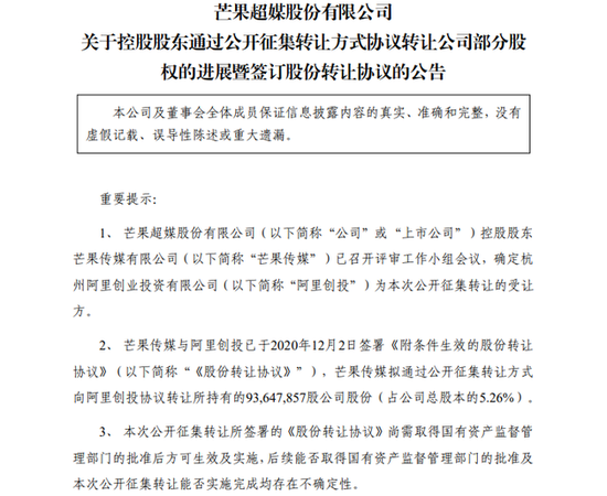芒果超媒:阿里创投拟协议受让控股股东所持5.26%股份