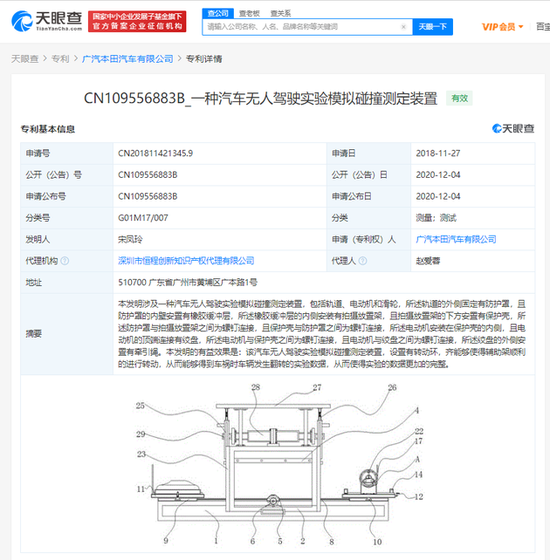 鞭牛士BiaNews消息:天眼查App显示,近日,广汽本田汽车有限公司新增多条专利信息,其中一条为“一种汽车无人驾驶实验模拟碰撞测定装置”,申请日在2018年11月,公布日在2020年12月。