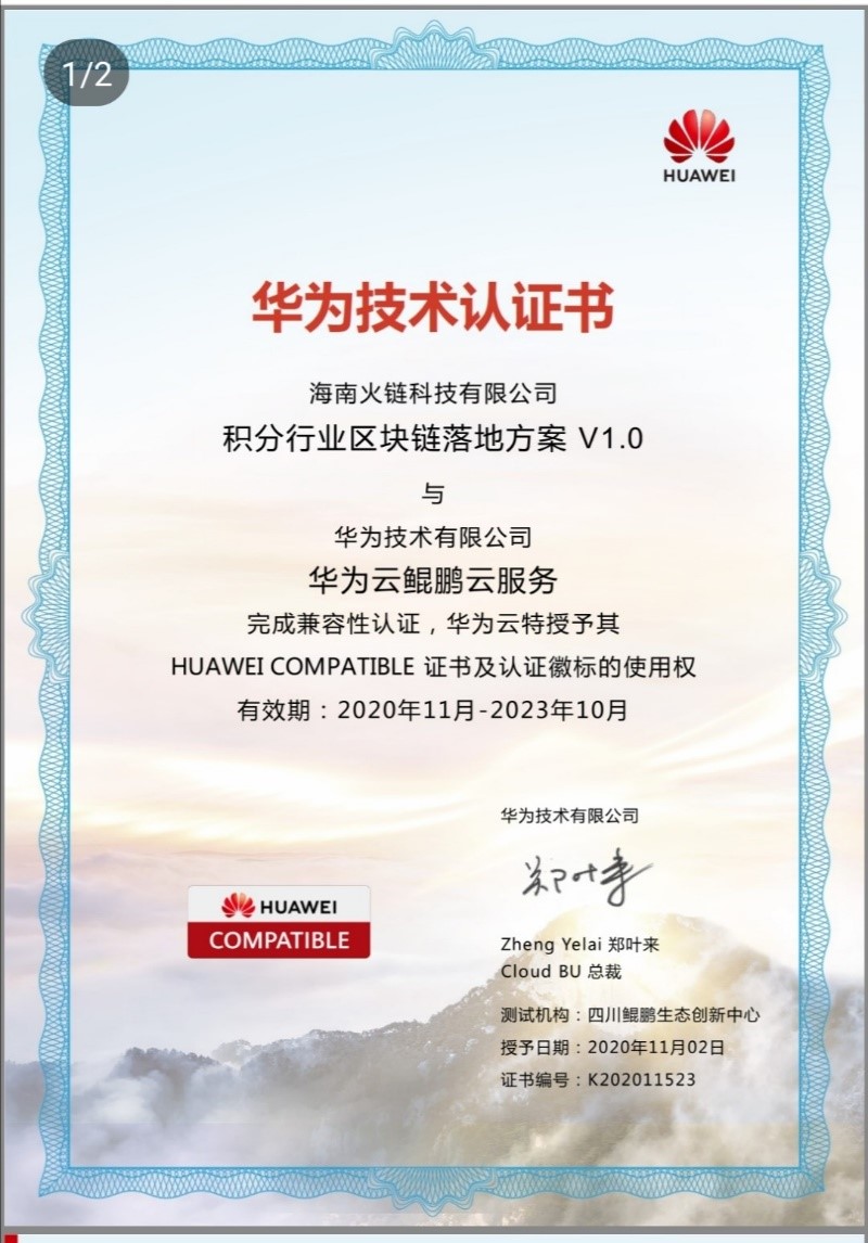 11月,火链科技“积分行业区块链落地方案V1.0”以高度的安全性、稳定性和兼容性完成华为的鲲鹏兼容认证测试,并获得HUAWEI COMPATIBLE技术认证书,正式成为华为云“鲲鹏凌云伙伴”。