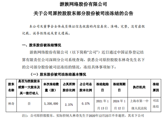 鞭牛士 1月15日消息,游族网络发布公告称,公司原控股股东林奇所持520万股公司股份(占总股本的0.57%)被司法冻结。上述冻结事项未对公司正常经营产生影响。