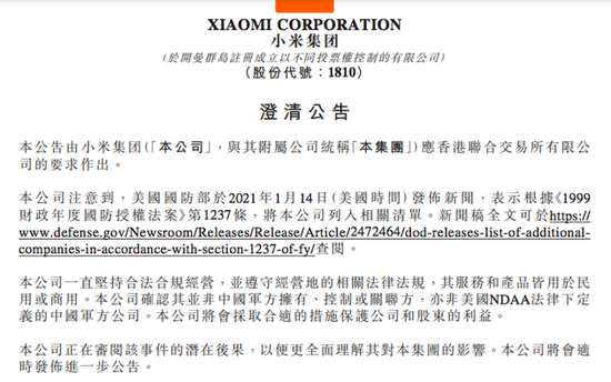 鞭牛士 1月15日消息,小米集团在港交所发布澄清公告称,公司一直坚持合法合规经营,并遵守经营地的相关法律法规,服务和产品皆用于民用或商用。公司确认并非中国军方拥有、控制或关联方,亦非美国NDAA法律下定义的中国军方公司。