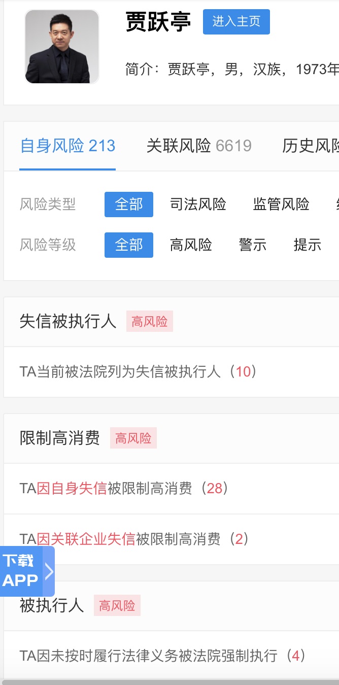 据企查查风险信息显示,贾跃亭已身负 30 条限制高消费令,其自身已 10 次被列为失信被执行人、4 次被列为被执行人。