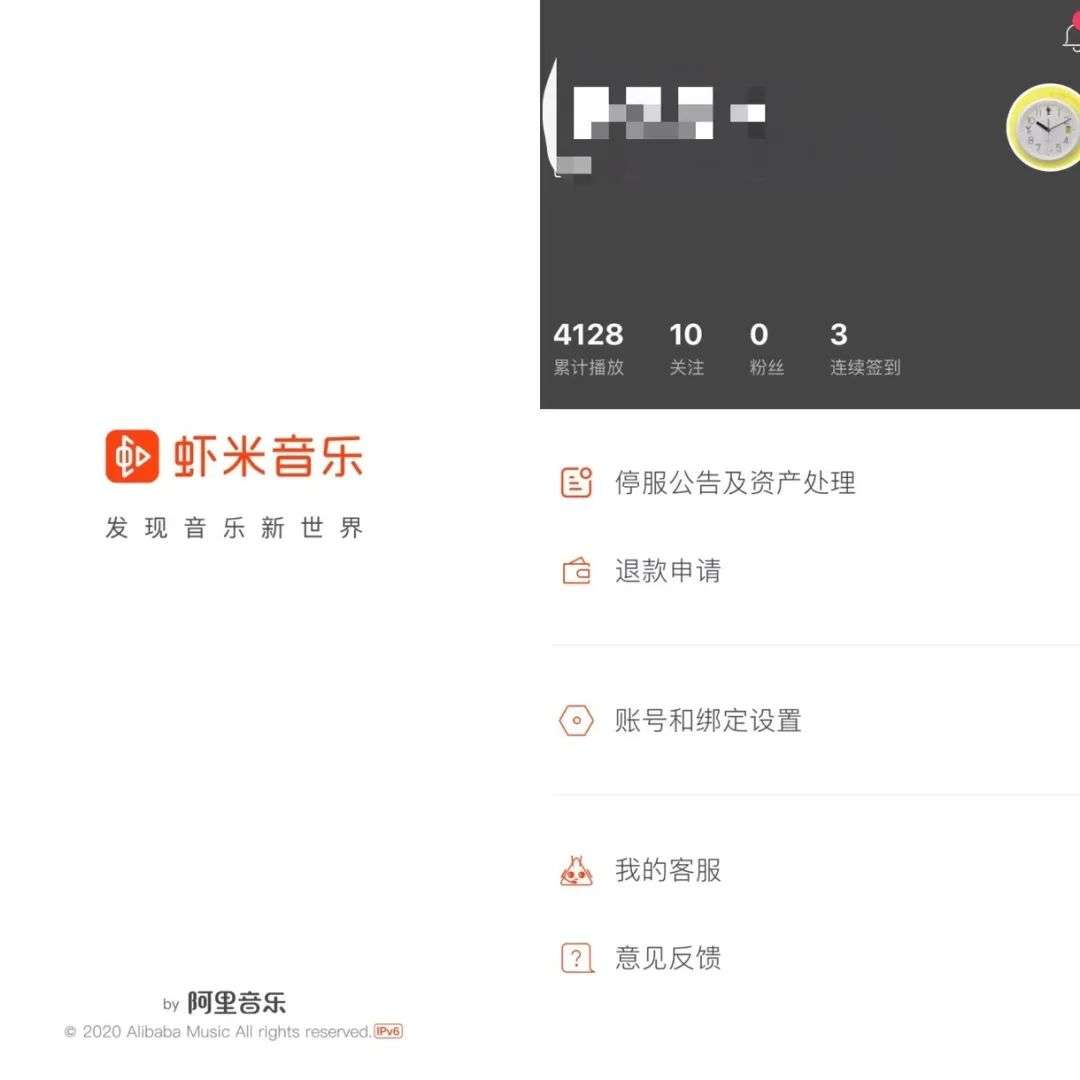虾米APP关闭大部分功能,只能显示以上页面,图源虾米APP