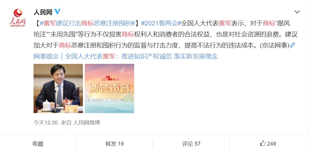 鞭牛士 3月8日消息,据人民网消息,2021 年全国两会前,北京知识产权法院党组成员、副院长兼政治部主任宋鱼水与全国人大代表、全国工商联副主席、小米科技创始人、董事长雷军进行座谈交流,谈到了知识产权保护、商标抢注及囤积等话题。