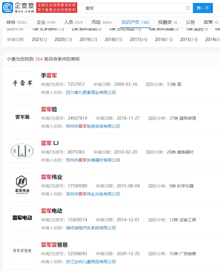 企查查 APP 显示,目前有关 “雷军”商标申请记录共 364 条,其中包含多家公司抢注申请,抢注商标名称包含冠雷军、手雷军、雷军验、雷军电动、雷军雷爸爸等。