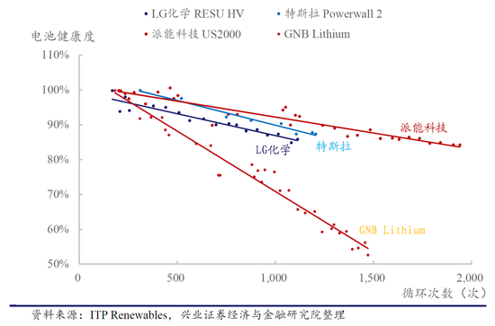 再看几家产品的循环寿命,派能的产品性能优势明显,在1500次使用后仍能具备90%寿命,与特斯拉和LG1000次使用后的健康度不相上下。