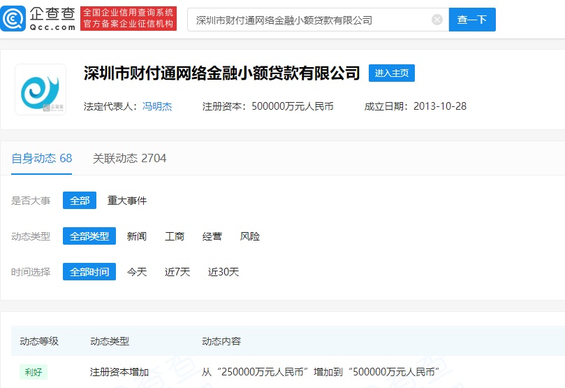 鞭牛士 4月13日消息,近日,深圳市财付通网络金融小额贷款有限公司发生工商变更,注册资本由 25 亿人民币增至 50 亿人民币,增幅 100%。