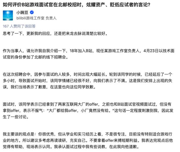“小豌豆”自称当日校招的面试官,“4月23日以技术面试官的身份参加了招聘会”。据他描述,当日,因面试时间被延长,爆料同学出现不满情绪,又对“之前面试过B站却没有拿到offer”表示不服气,“大厂都给我offer,小厂竟然没有给”。该面试官称,上述同学的话一定程度上刺激到了他,进而发生了一些讨论。