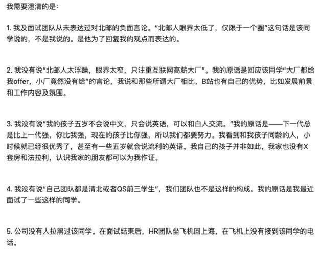 值得注意的是,网帖中提及B站面试官抛出了“自己团队都是清北或者QS前三学生”说法。而事实上,B站创始人徐逸的母校正是北京邮电大学。对此,该面试官辩称,其原话是近期面试了一些这样的同学,团队并非上述构成。