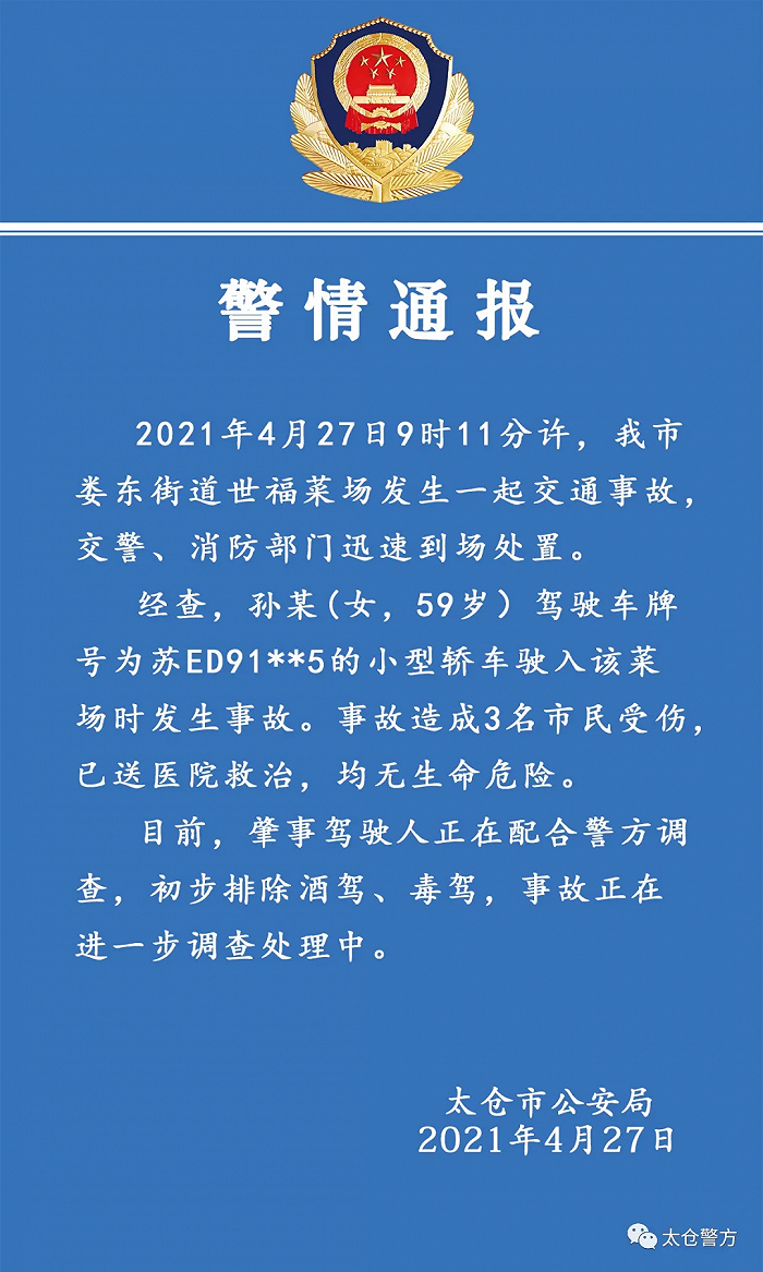 鞭牛士 4月27日消息,据江苏太仓警方通报,4月27日9时11分许,太仓市娄东街道世福菜场发生一起交通事故。经查,孙某(女,59岁)驾驶车牌号为苏ED91**5的小型轿车驶入该菜场时发生事故。事故造成3名市民受伤,已送医院救治,均无生命危险。目前,肇事驾驶人正在配合警方调查,初步排除酒驾、毒驾,事故正在进一步调查处理中。