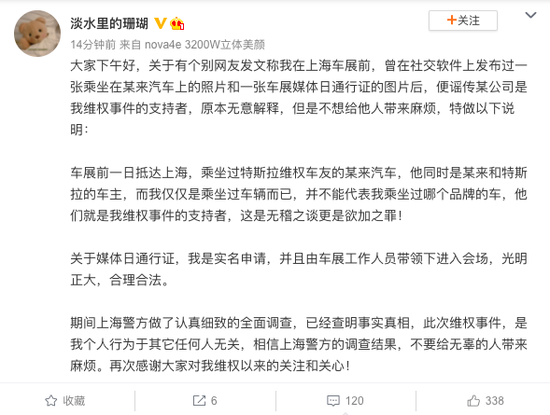 大家下午好,关于有个别网友发文称我在上海车展前,曾在社交软件上发布过一张乘坐在某来汽车上的照片和一张车展媒体日通行证的图片后,便谣传某公司是我维权事件的支持者,原本无意解释,但是不想给他人带来麻烦,特做以下说明:
