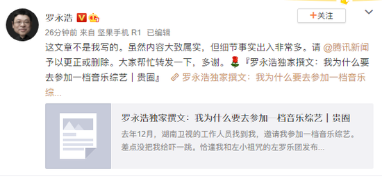 鞭牛士 5月8日消息,今日下午,@罗永浩在微博转发了一篇名为《罗永浩独家撰文:我为什么要去参加一档音乐综艺|贵圈》的文章,他表示,“这文章不是我写的”,表示“虽然内容大致属实,但细节事实出入非常多”,并且@了腾讯新闻。